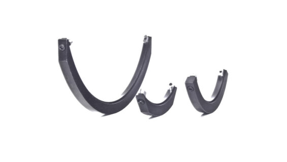 Radial cams are bent to suit the profile radius from drawn steel  profiles. Available cam height options are 12.5 mm, 14 mm and 16 mm.  Radial cams are supplied for non-contact signalling (proximity cams) or  for mechanical actuation with an approach angle of 26° 34′ to DIN 69639.  This corresponds to an incline of the approach angle of the cam in the  ratio 1: 2 (2 mm sliding of the cam = 1 mm slide stroke on the position  switch).